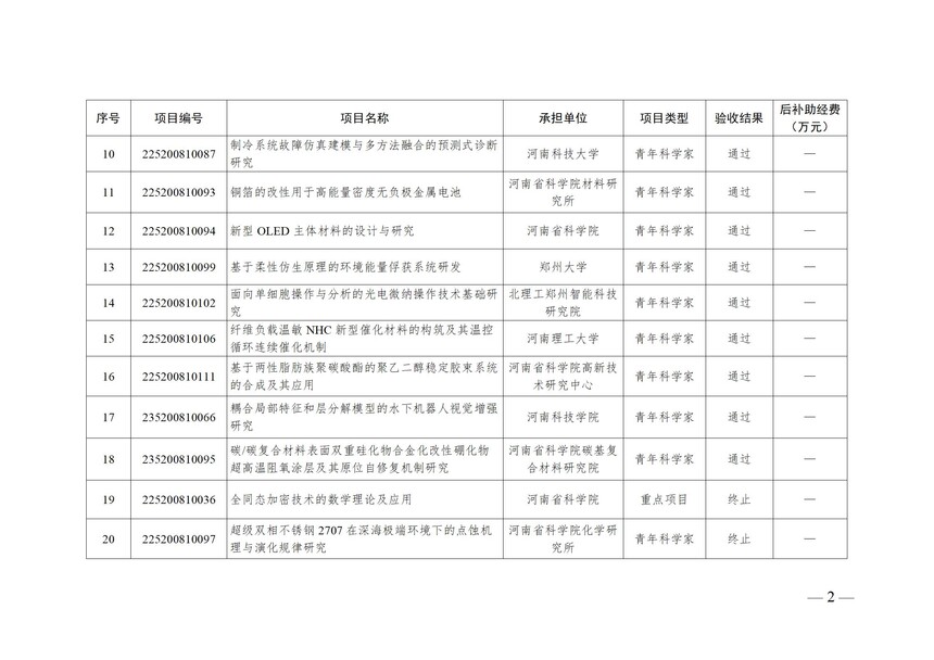 河南省科學(xué)技術(shù)廳 河南省科學(xué)院 關(guān)于公布2025年省級科技研發(fā)計劃聯(lián)合基金項目驗收結(jié)果的通知河南省科學(xué)技術(shù)廳 河南省科學(xué)院 關(guān)于公布2025年省級科技研發(fā)計劃聯(lián)合基金項目驗收結(jié)果的通知 豫科項〔2026〕1號 各有關(guān)市、縣科技局,省直有關(guān)部門,各有關(guān)單位: 根據(jù)《河南省科技計劃項目管理辦法(試行)》(豫科〔2016〕83號)、《河南省省級科技研發(fā)計劃聯(lián)合基金管理暫行辦法》(豫財科〔2021〕49號),省科技廳、省科學(xué)院委托省科研平臺服務(wù)中心組織開展了省級科技研發(fā)計劃聯(lián)合基金項目驗收和績效評價工作,并對驗收結(jié)果進行了公示。鄭州機械研究所有限公司等單位承擔(dān)的18個項目通過驗收,另有4個項目予以終止。請各有關(guān)單位進一步加強項目實施和經(jīng)費支出管理,提高項目績效。